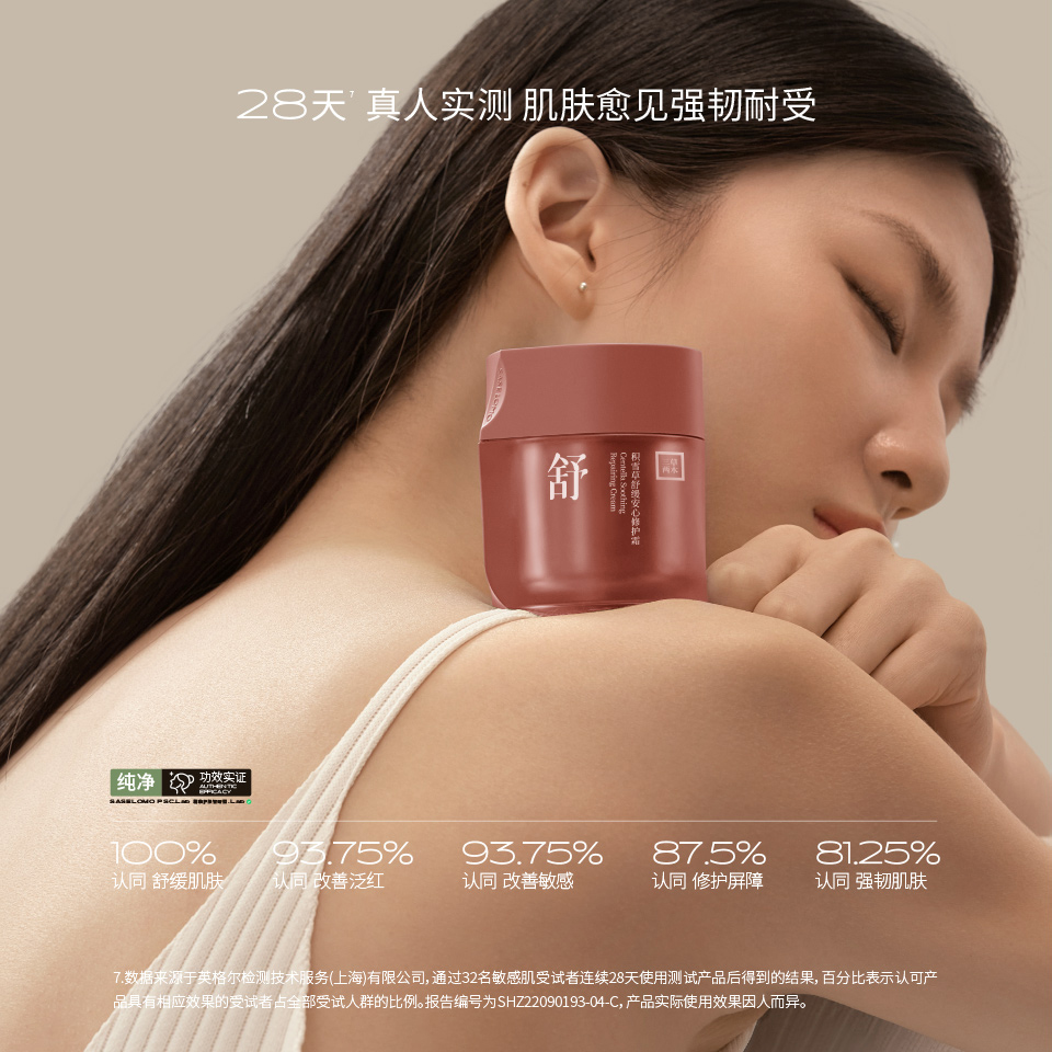 7.数据来源于英格尔检测技术服务(上海)有限公司,通过32名敏感肌受试者连续28天使用测试产品后得到的结果,百分比表示认可产品具有相应效果的受试者占全部受试人群的比例。报告编号为SHZ22090193-04-C,产品实际使用效果因人而异。