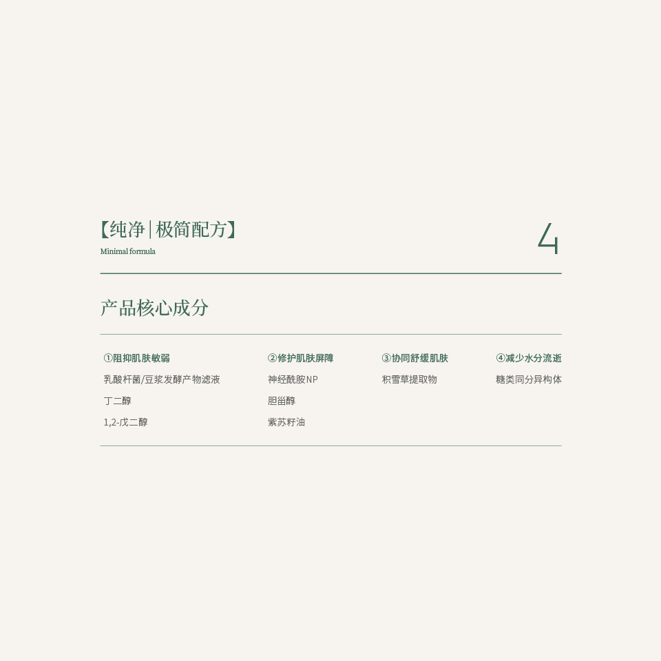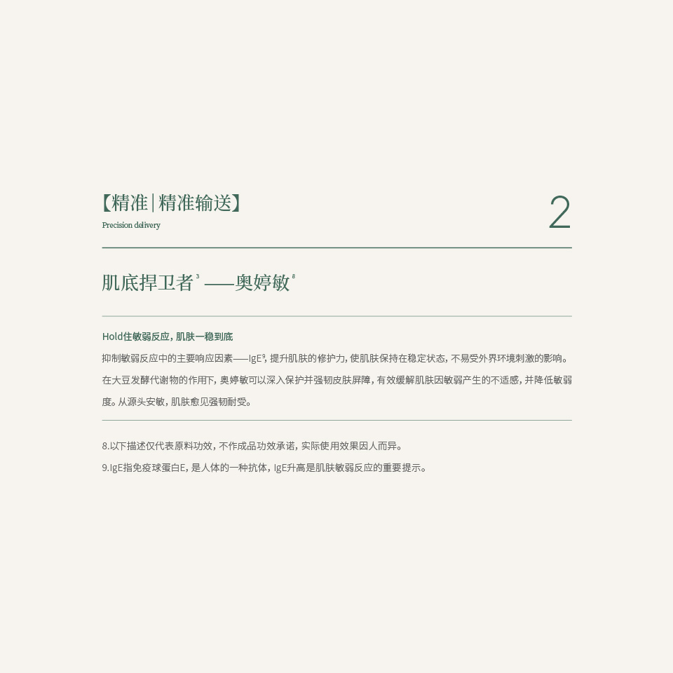 抑制敏弱反应中的主要响应因素——IgE9,提升肌肤的修护力,使肌肤保持在稳定状态,不易受外界环境刺激的影响。
